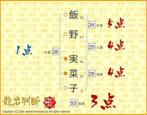 飯(13画)野(11画) 実(14画)菜(12画)子(3画)