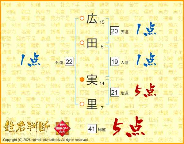 広田実里さんの総運は41画の5点!