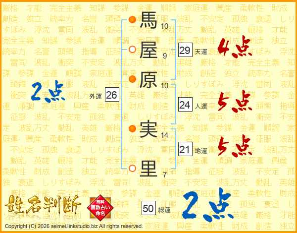 馬(10画)屋(9画)原(10画) 実(14画)里(7画)