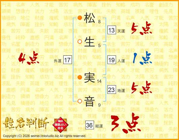 松(8画)生(5画) 実(14画)音(9画)