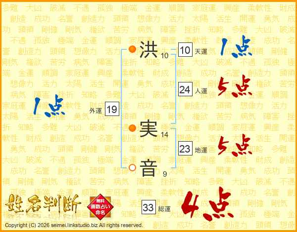 洪(10画) 実(14画)音(9画)