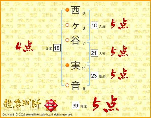 西(6画)ヶ(3画)谷(7画) 実(14画)音(9画)