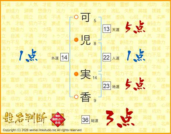 生活面を象徴する運勢です。外部から受ける影響力を表し、結婚運、家庭運や職場、環境への順応性を表します。総運から人運を引いた画数。姓や名が1文字の場合を除く。