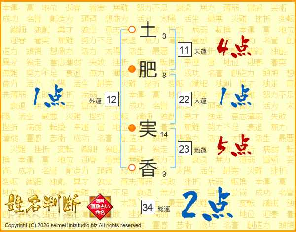 生活面を象徴する運勢です。外部から受ける影響力を表し、結婚運、家庭運や職場、環境への順応性を表します。総運から人運を引いた画数。姓や名が1文字の場合を除く。