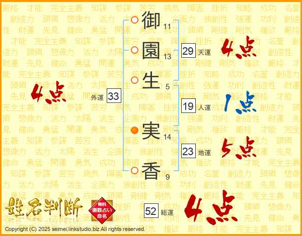 御(11画)園(13画)生(5画) 実(14画)香(9画)