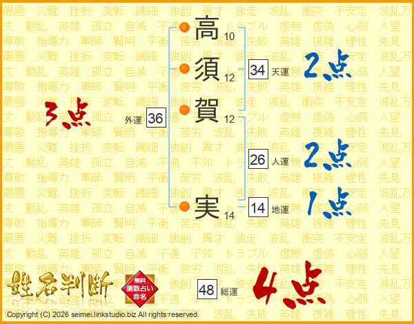 生活面を象徴する運勢です。外部から受ける影響力を表し、結婚運、家庭運や職場、環境への順応性を表します。総運から人運を引いた画数。姓や名が1文字の場合を除く。