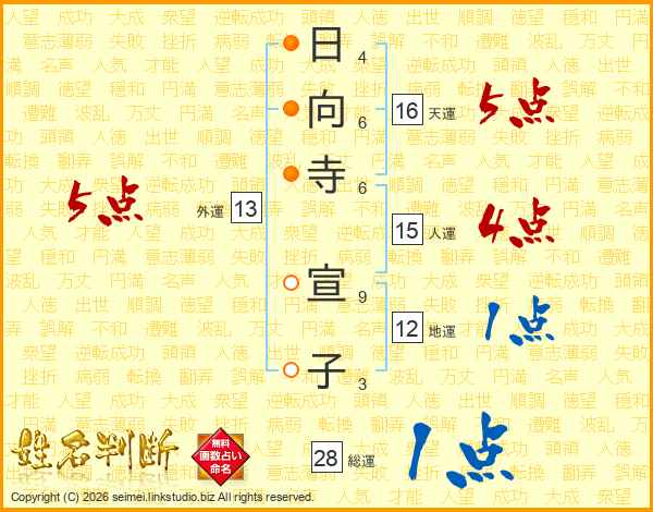 日(4画)向(6画)寺(6画) 宣(9画)子(3画)