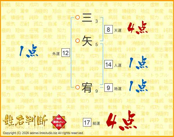 生活面を象徴する運勢です。外部から受ける影響力を表し、結婚運、家庭運や職場、環境への順応性を表します。総運から人運を引いた画数。姓や名が1文字の場合を除く。