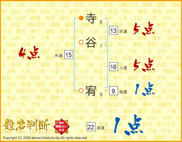 あなたの人生を表す1番重要な運勢です。生涯を通じて影響する総合運となり、主に50歳以降の晩年期に影響を及ぼします。苗字と名前の合計画数。