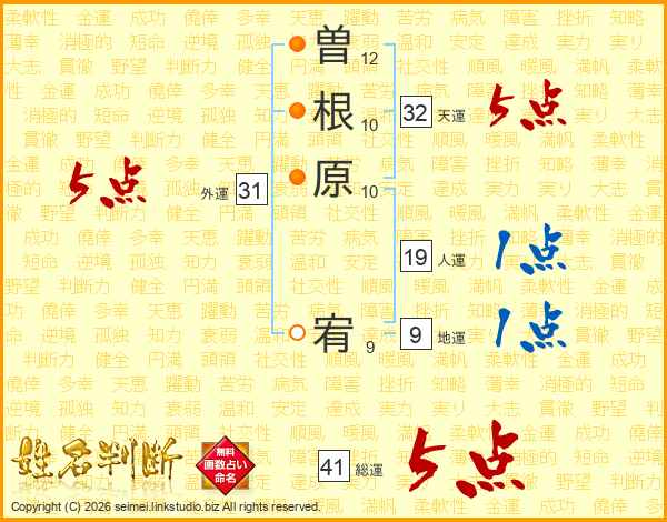 曽根原宥さんの総運は41画の5点!