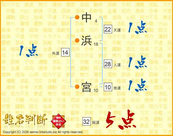 生活面を象徴する運勢です。外部から受ける影響力を表し、結婚運、家庭運や職場、環境への順応性を表します。総運から人運を引いた画数。姓や名が1文字の場合を除く。