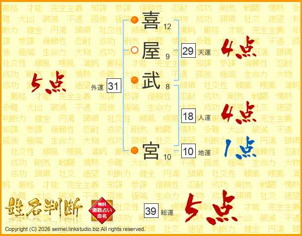 喜(12画)屋(9画)武(8画) 宮(10画)