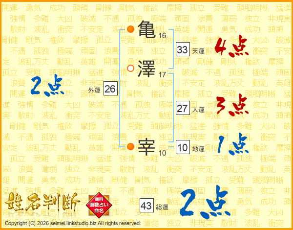 亀澤宰さんの総運は43画の2点!