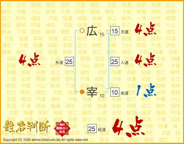 生活面を象徴する運勢です。外部から受ける影響力を表し、結婚運、家庭運や職場、環境への順応性を表します。総運から人運を引いた画数。姓や名が1文字の場合を除く。