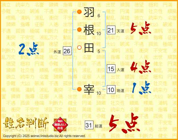 生活面を象徴する運勢です。外部から受ける影響力を表し、結婚運、家庭運や職場、環境への順応性を表します。総運から人運を引いた画数。姓や名が1文字の場合を除く。