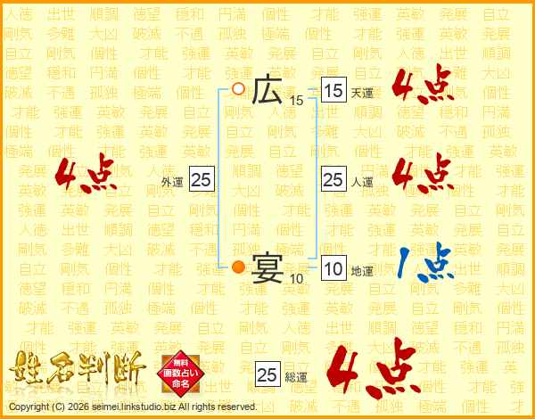 生活面を象徴する運勢です。外部から受ける影響力を表し、結婚運、家庭運や職場、環境への順応性を表します。総運から人運を引いた画数。姓や名が1文字の場合を除く。