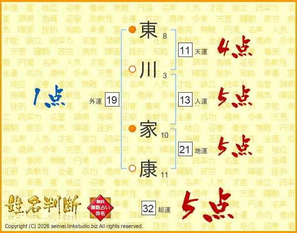 東川家康さんの総運は32画の5点!