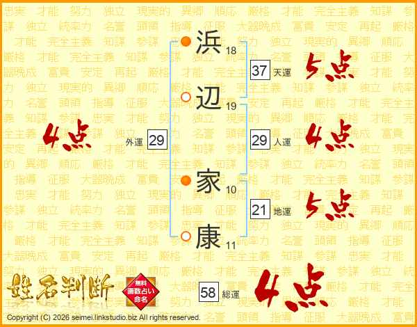 浜辺家康さんの総運は58画の4点!