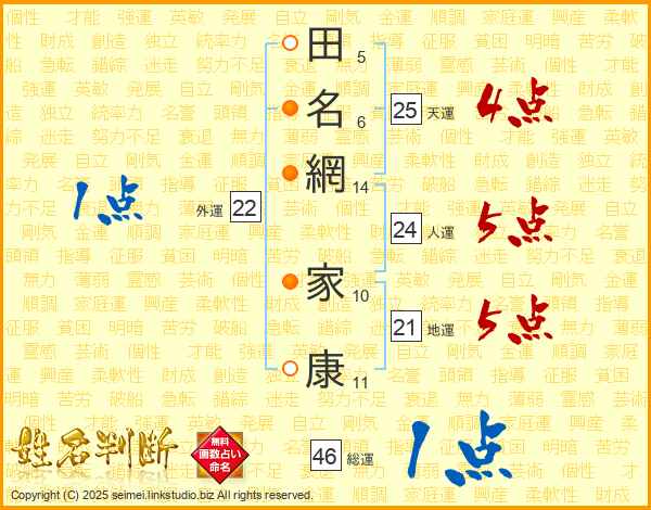 田(5画)名(6画)網(14画) 家(10画)康(11画)