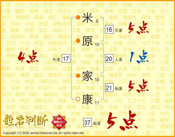 米原家康さんの総運は37画の5点!
