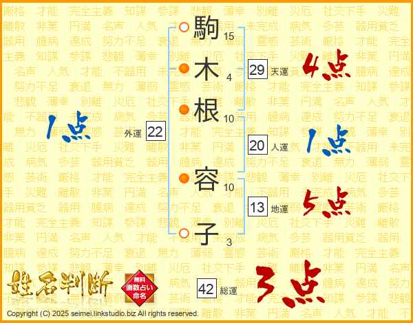 駒(15画)木(4画)根(10画) 容(10画)子(3画)