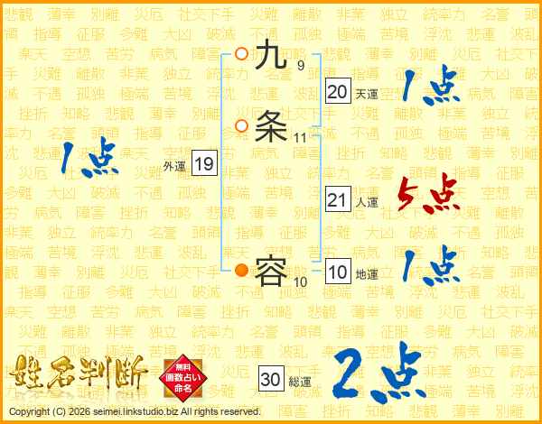 生活面を象徴する運勢です。外部から受ける影響力を表し、結婚運、家庭運や職場、環境への順応性を表します。総運から人運を引いた画数。姓や名が1文字の場合を除く。
