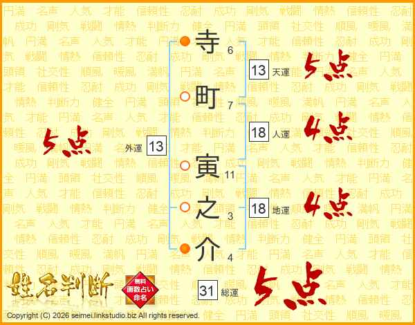 寺(6画)町(7画) 寅(11画)之(3画)介(4画)