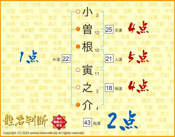 小(3画)曽(12画)根(10画) 寅(11画)之(3画)介(4画)