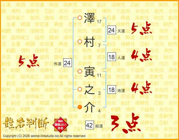 澤(17画)村(7画) 寅(11画)之(3画)介(4画)