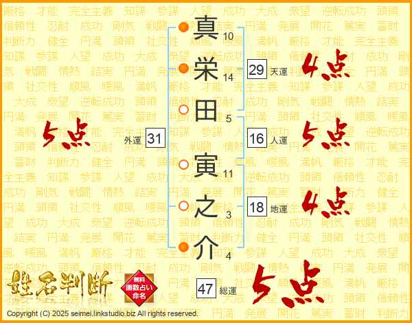 真(10画)栄(14画)田(5画) 寅(11画)之(3画)介(4画)