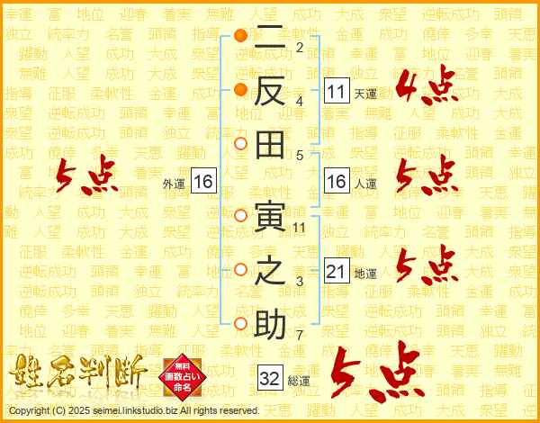 二(2画)反(4画)田(5画) 寅(11画)之(3画)助(7画)
