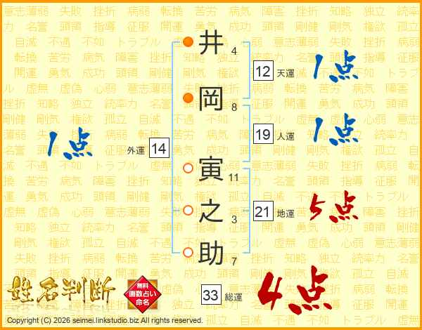 井(4画)岡(8画) 寅(11画)之(3画)助(7画)