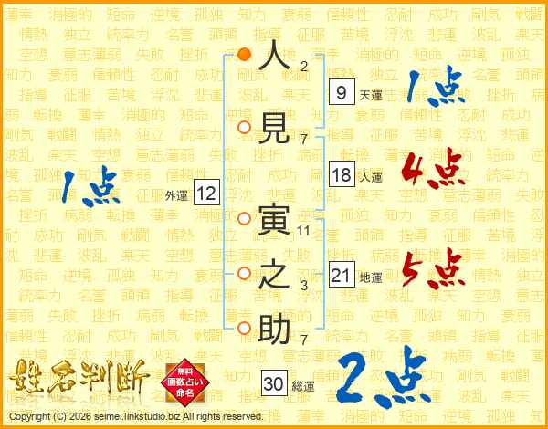 人(2画)見(7画) 寅(11画)之(3画)助(7画)