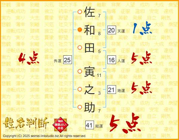 佐(7画)和(8画)田(5画) 寅(11画)之(3画)助(7画)
