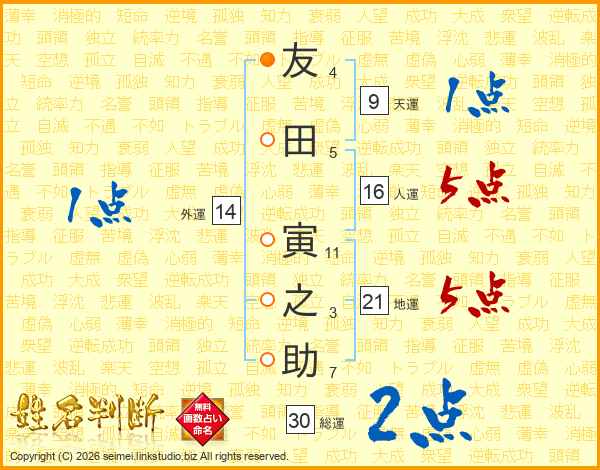 友(4画)田(5画) 寅(11画)之(3画)助(7画)