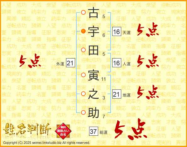 古(5画)宇(6画)田(5画) 寅(11画)之(3画)助(7画)