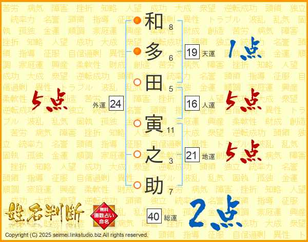 和(8画)多(6画)田(5画) 寅(11画)之(3画)助(7画)