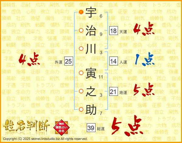 宇(6画)治(9画)川(3画) 寅(11画)之(3画)助(7画)