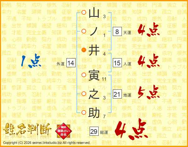 山(3画)ノ(1画)井(4画) 寅(11画)之(3画)助(7画)