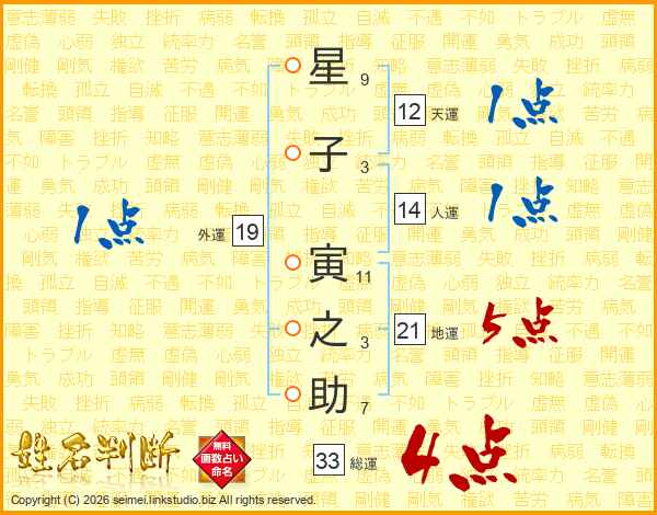 星(9画)子(3画) 寅(11画)之(3画)助(7画)