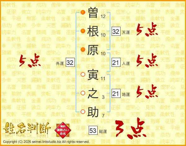 曽(12画)根(10画)原(10画) 寅(11画)之(3画)助(7画)