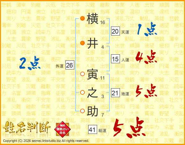 横(16画)井(4画) 寅(11画)之(3画)助(7画)
