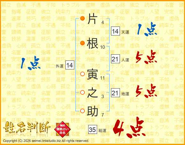 片(4画)根(10画) 寅(11画)之(3画)助(7画)