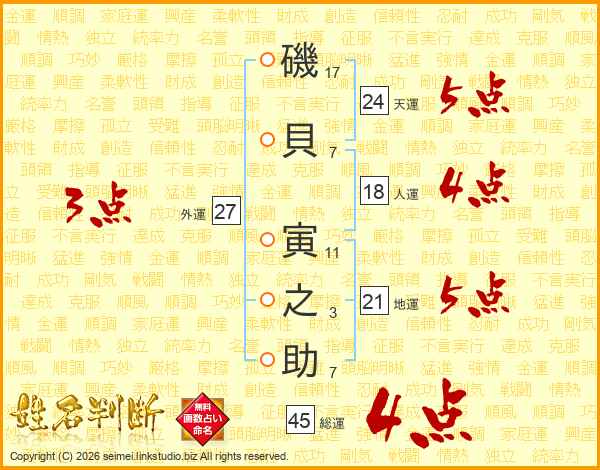 磯(17画)貝(7画) 寅(11画)之(3画)助(7画)