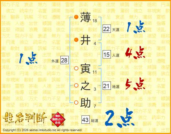 薄(18画)井(4画) 寅(11画)之(3画)助(7画)