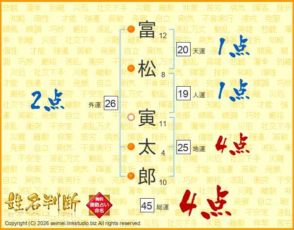 富(12画)松(8画) 寅(11画)太(4画)郎(10画)