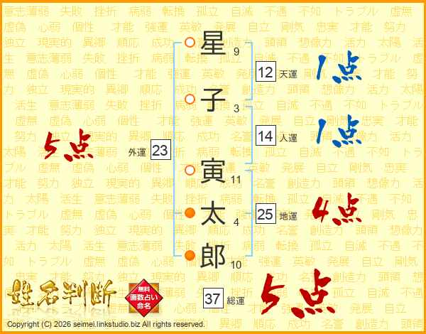 星(9画)子(3画) 寅(11画)太(4画)郎(10画)