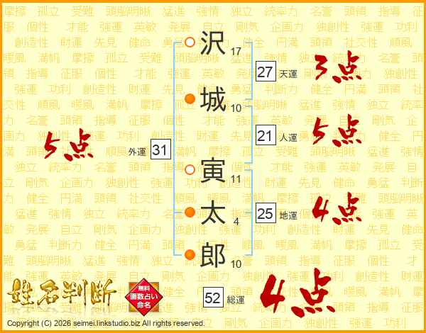 沢(17画)城(10画) 寅(11画)太(4画)郎(10画)
