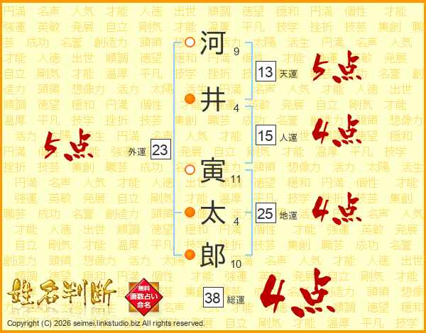 河(9画)井(4画) 寅(11画)太(4画)郎(10画)