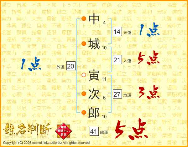 中(4画)城(10画) 寅(11画)次(6画)郎(10画)